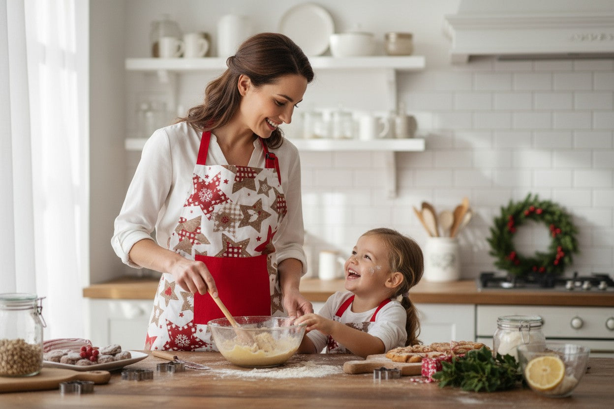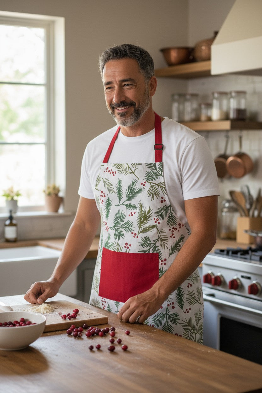 Bring the festive spirit into your kitchen with our premium 100% cotton Chirstmas apron. Perfect for cooking, baking and hosting this beautifully designed apron combines comfort, style and practicality for the holiday season.